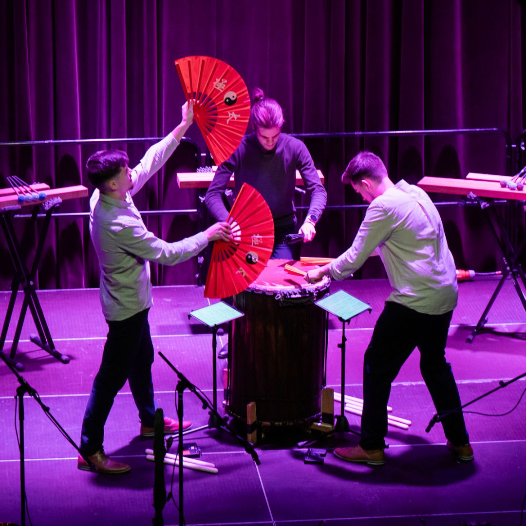 Percussie is een ontzettend oud instrument, maar sommige percussie-instrumenten, zoals de marimba, zijn relatief jong – slechts zo’n honderd jaar oud. Hierdoor zijn tot op heden weinig stukken beschikbaar, en al helemaal niet voor een trio-setting. Zelf werken wij weleens met een dobbelsteen. Waarbij elk vlak staat voor een bepaalde klank. Om de beurt gooien we de dobbelsteen, we noteren de uitkomsten en hier ontstaat een stuk uit.